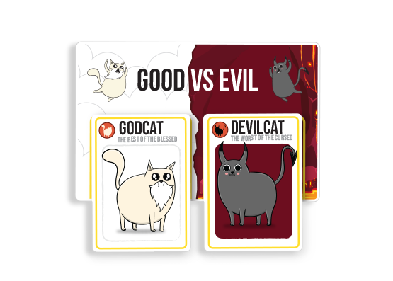 Exploding Kittens: Good vs Evil features brand-new artwork and characters from our first-ever Netflix series. This high-stakes game of kitty-powered Russian Roulette lets you outsmart your friends, raise heck, and stage your own epic battles…all while trying not to explode! Plus we’ve added Armageddon Cards that launch an exclusive mini-game where you duke it out for possession of the most powerful card we’ve ever created.