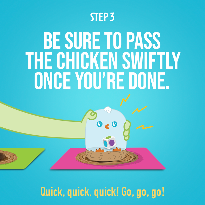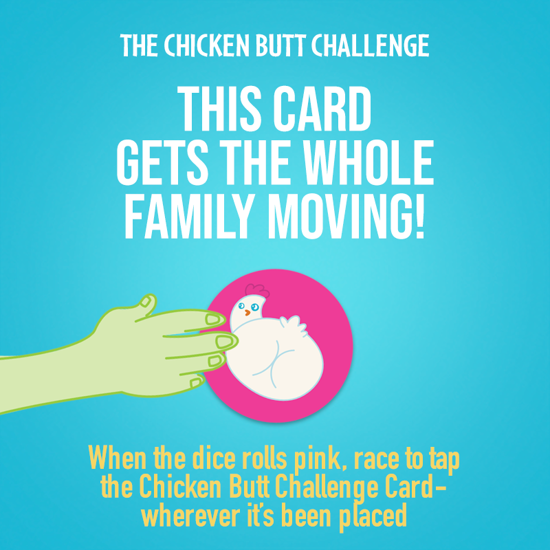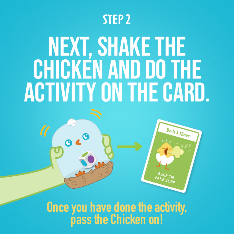 Shake the Chicken to reveal your activity, then quickly perform it before passing the Chicken Shaker to the next player. Don’t get caught holding the Chicken when the timer goes off! This game is fast, funny and it’s different every time. Plus, everyone has an equal chance to win…especially the little ones!
