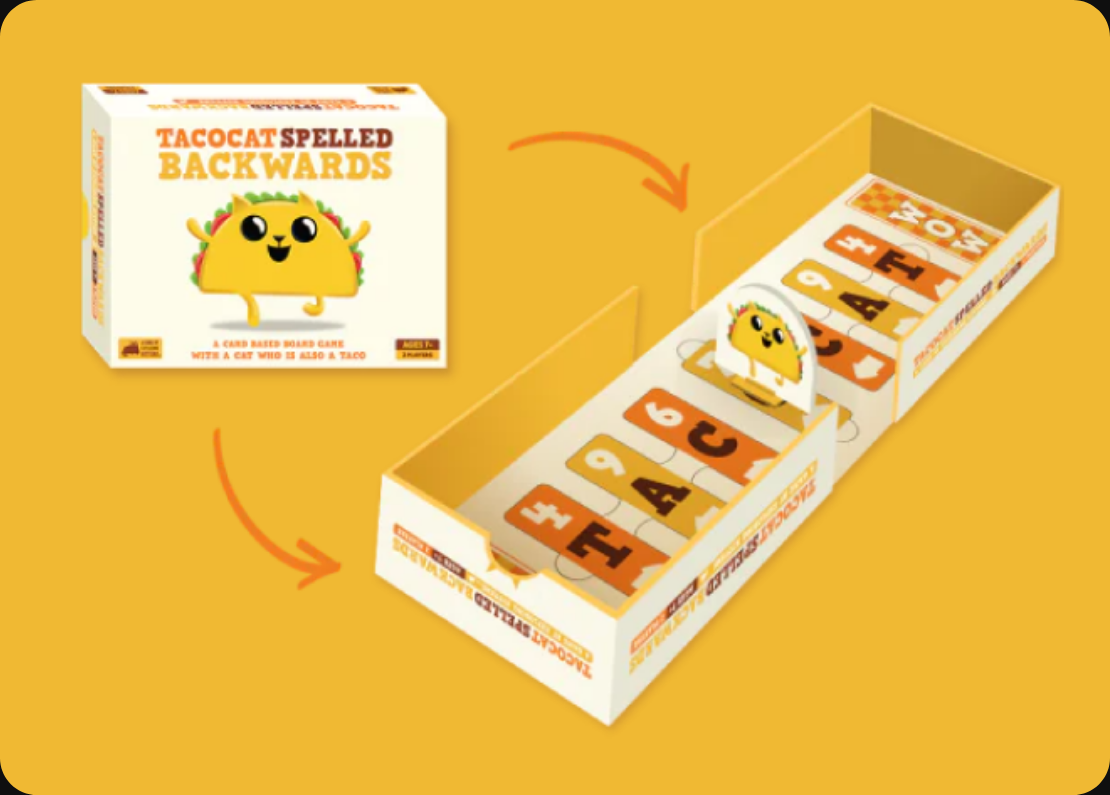 Tacocat Spelled Backwards is a game of clever card matchups in a box that is also a board with a cat who is also a taco. Unfold the box, then duel head-to-head in palindrome-themed battles. The higher card wins the round and brings Tacocat closer to your side. Each card victory moves you one step closer to winning.