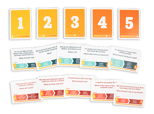 To play That Escalated Quickly: Grab and Game Edition read out a simple question (ex. I’m locked in a tiny room. What else is locked in here with me from cutest to scariest). Then everyone is assigned a secret number from one to five. Next, each player answers the question, and the intensity of that answer is based on their secret number (ex. 1= a bunny,5= a grizzly bear with chainsaw arms.) Finally, the person who read the question has to try and sort those answers into the correct order. If they get it right, everyone wins.